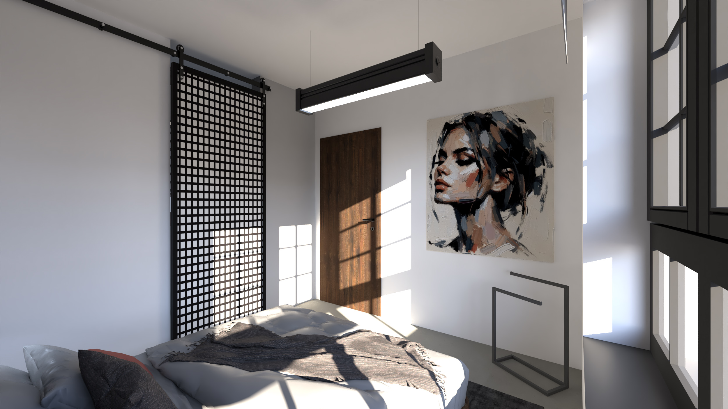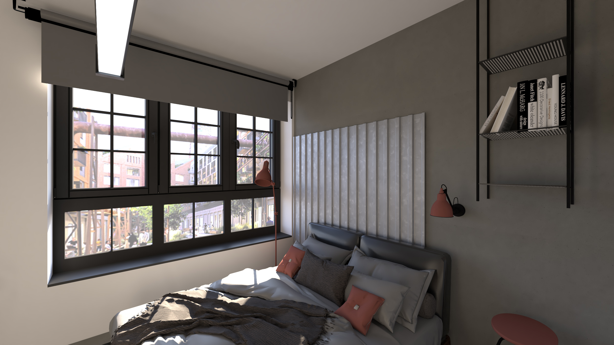 - Byt v nové rezidenční industriální čtvrti – návrh ložnice